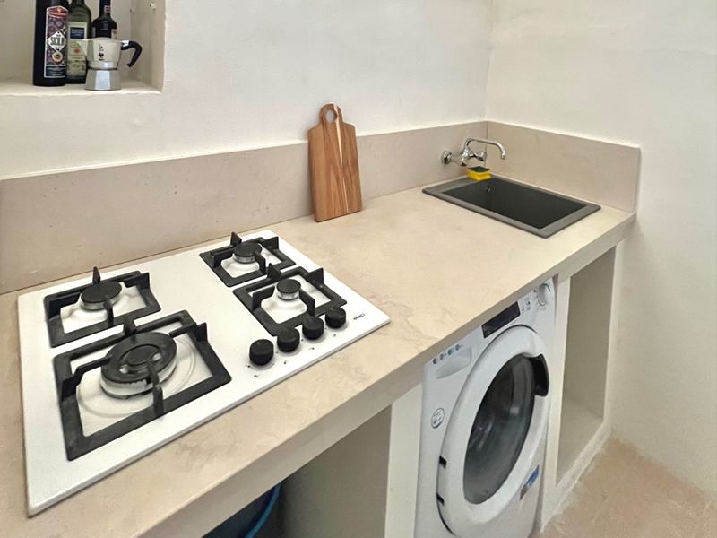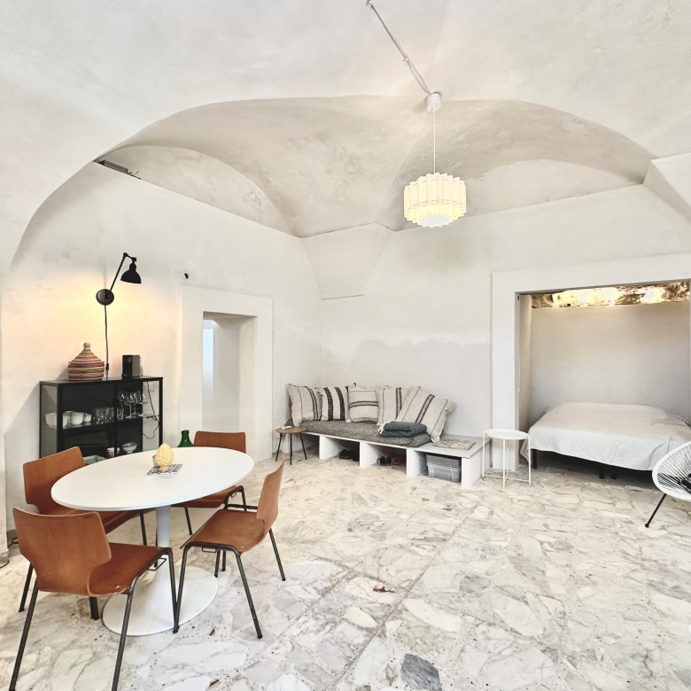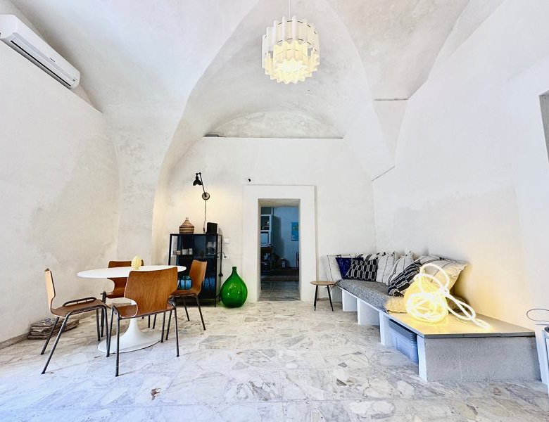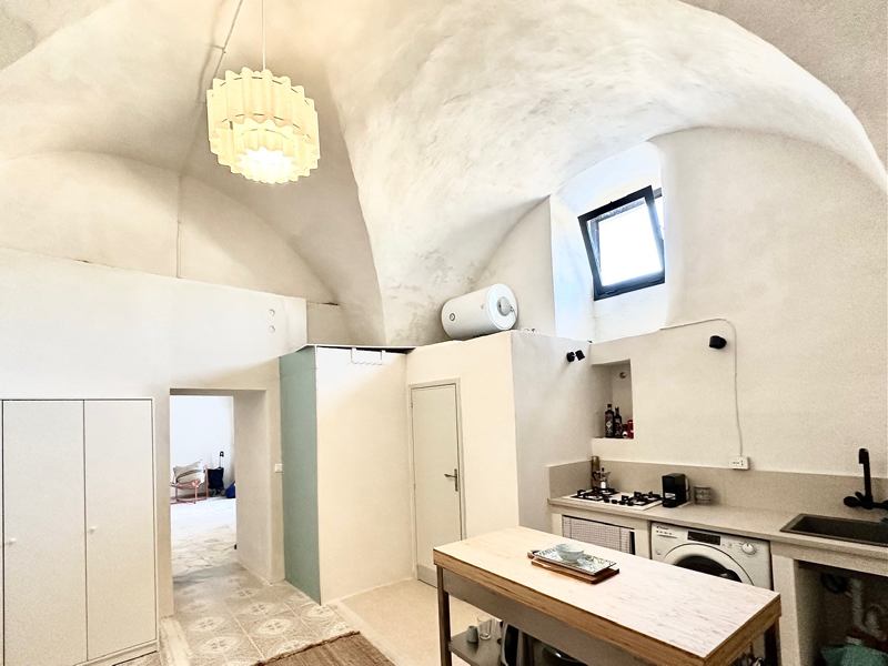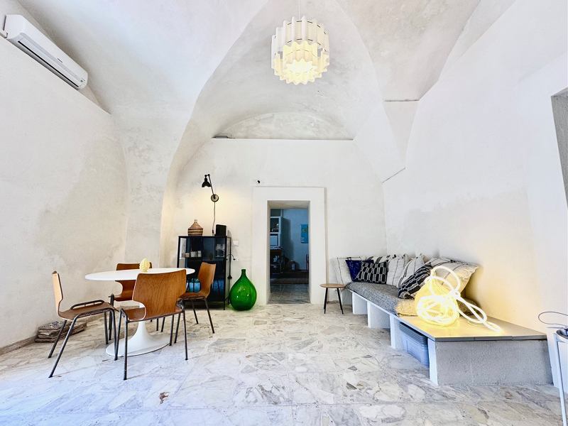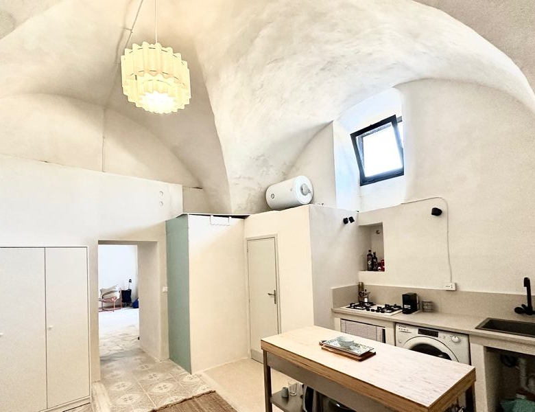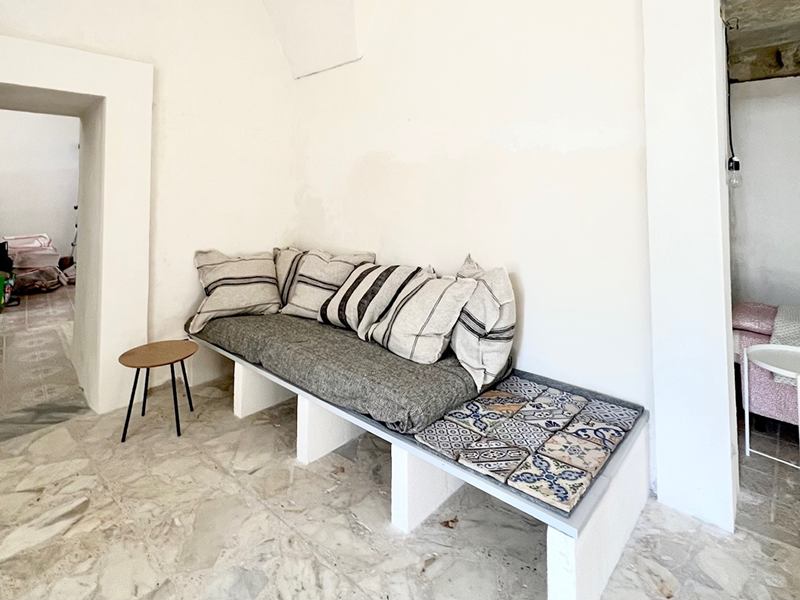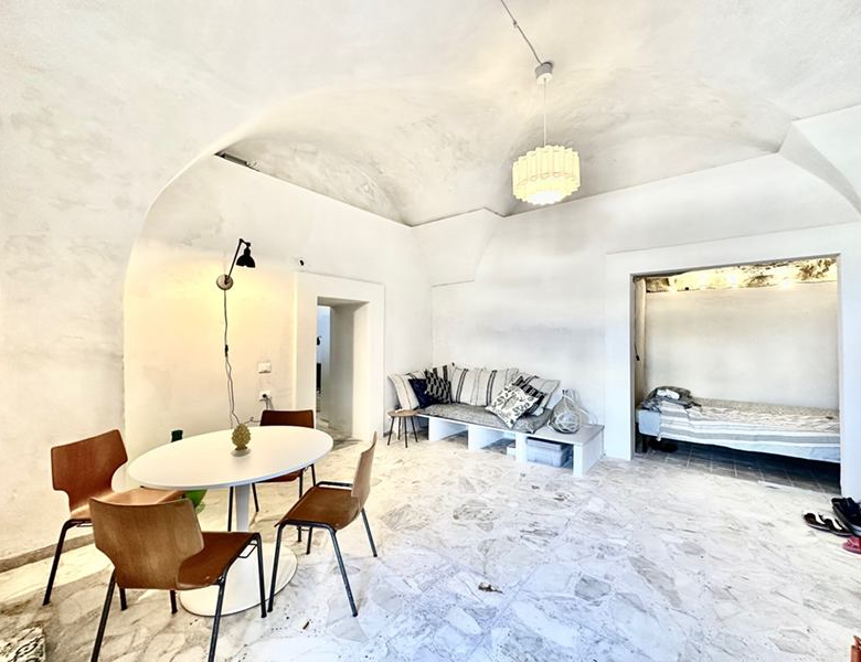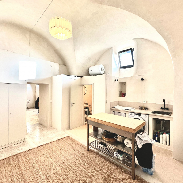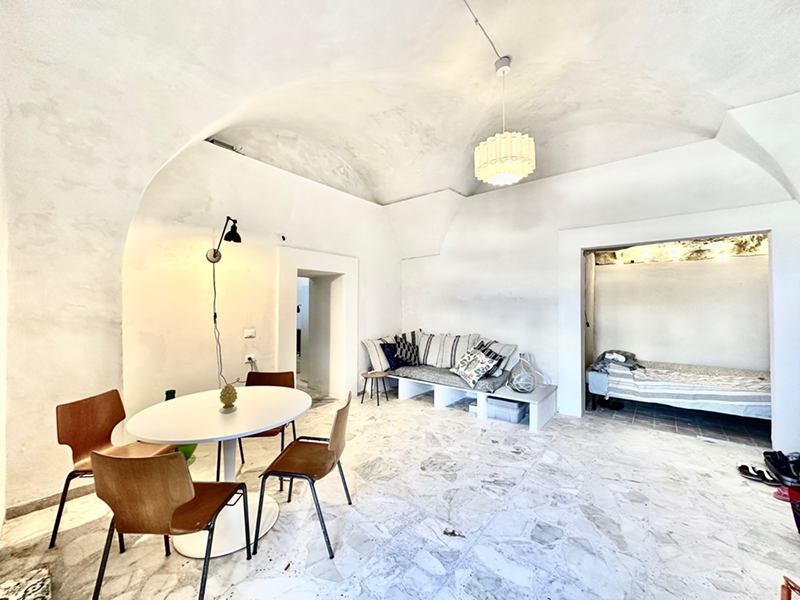 The house is the ground floor of a period property and has 4m high cross vaulted ceilings in stone, as well as a grotta in pietra viva. At present the house presents as follows: Entrance to 12mq terrace and from there to a living room, with bed in grotta. Access to the kitchen with cucina in muratura, and 3 piece bathroom. All the plumbing is newly done – there is also a large water cistern under the kitchen floor which means water will never be a problem. New doors and windows in double glazed aluminium and furnished with an eye to style and ready to move into.