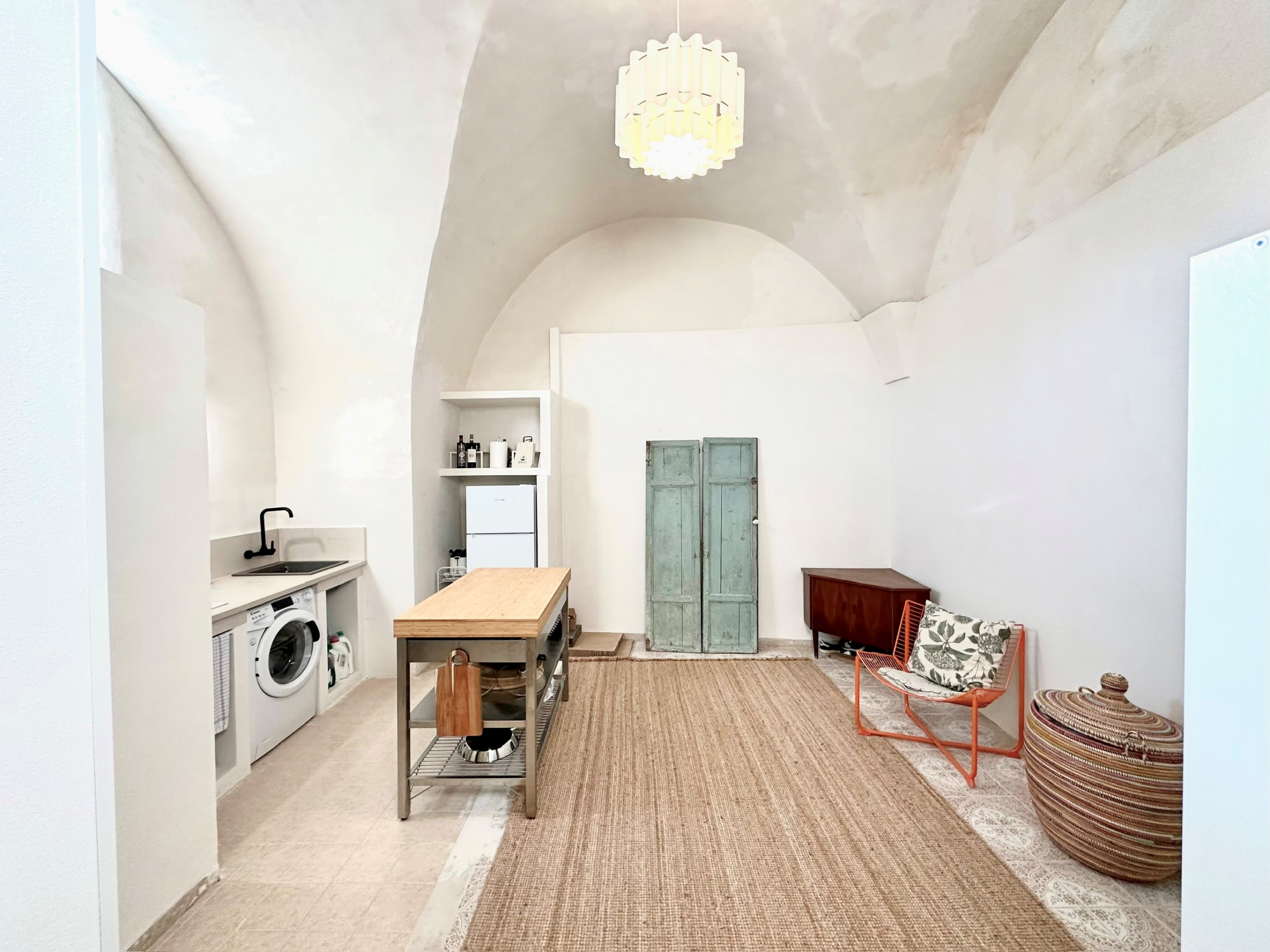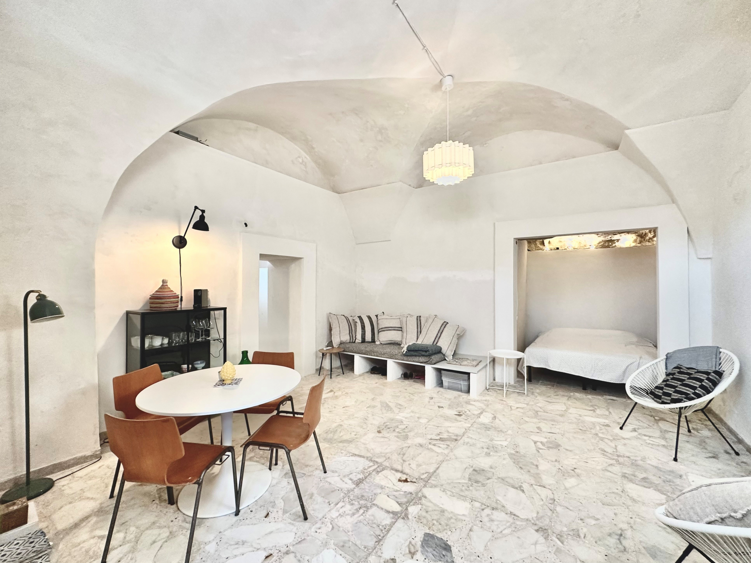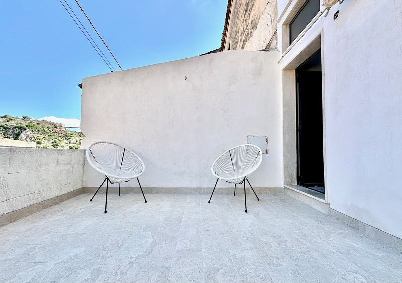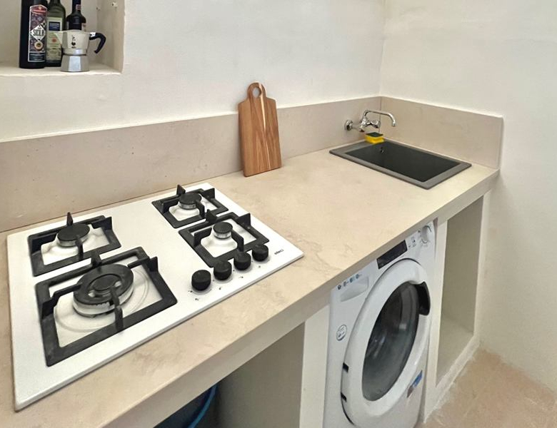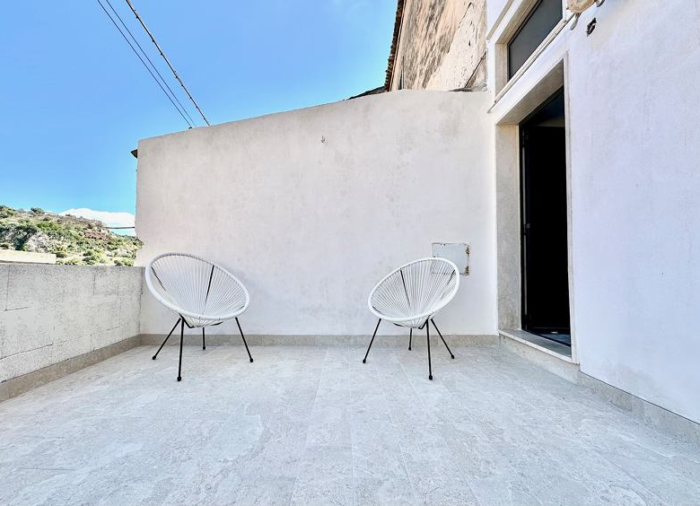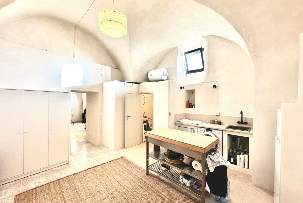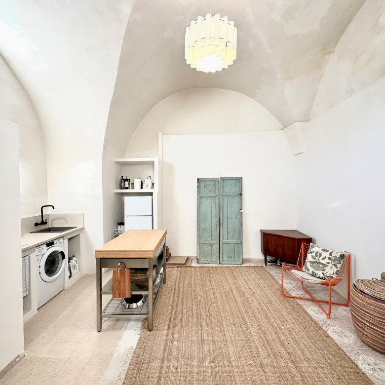 The house is the ground floor of a period property and has 4m high cross vaulted ceilings in stone, as well as a grotta in pietra viva. At present the house presents as follows: Entrance to 12mq terrace and from there to a living room, with bed in grotta. Access to the kitchen with cucina in muratura, and 3 piece bathroom. All the plumbing is newly done – there is also a large water cistern under the kitchen floor which means water will never be a problem. New doors and windows in double glazed aluminium and furnished with an eye to style and ready to move into.