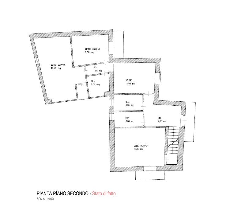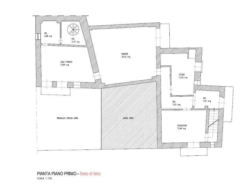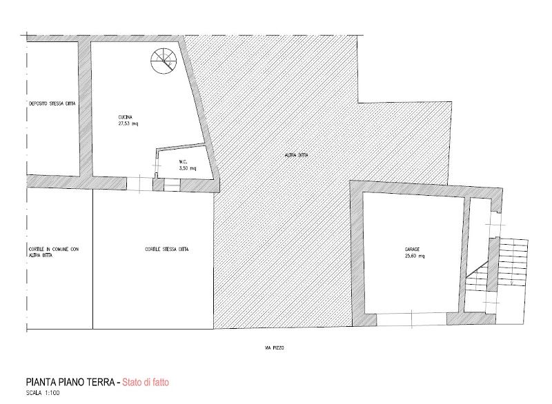 Scale che portano all’ingresso principale con un soggiorno, uno studio e un salone al piano principale, oltre a una sala da pranzo con scale che scendono a una grande cucina dammusato con accesso a un cortile e a una terrazza. Al secondo piano si trovano attualmente 2 camere matrimoniali, una camera singola, un ripostiglio e un bagno. Al piano strada si trova un ampio garage di 26mq.
