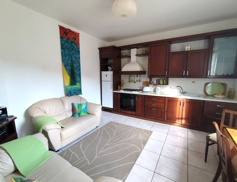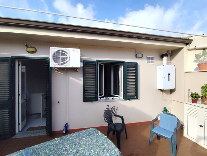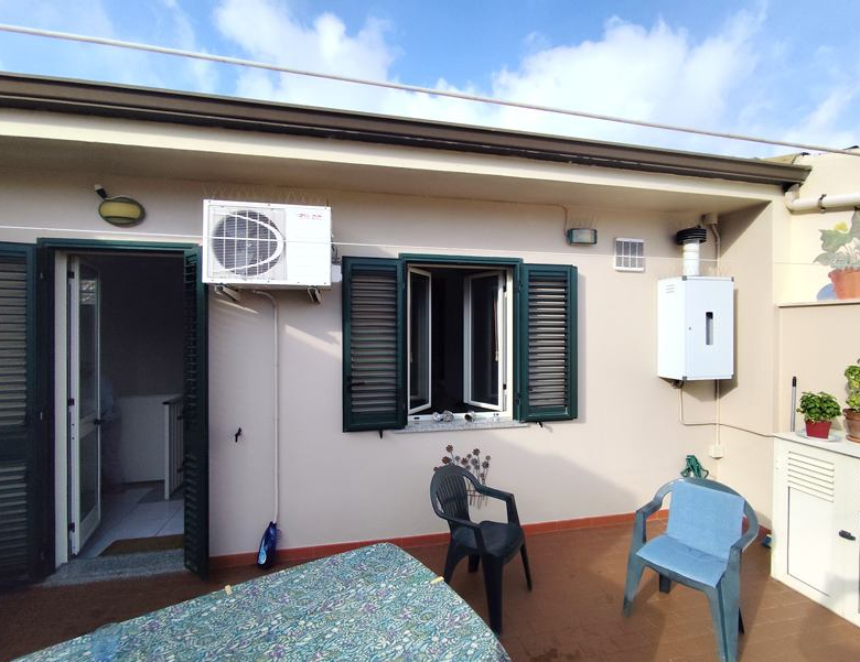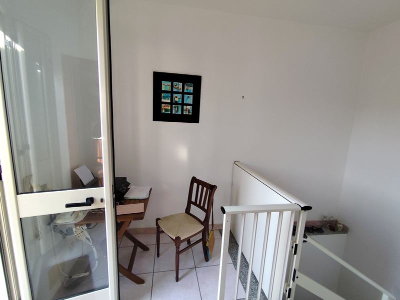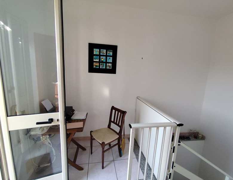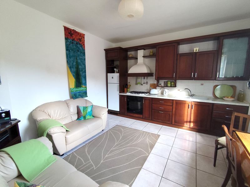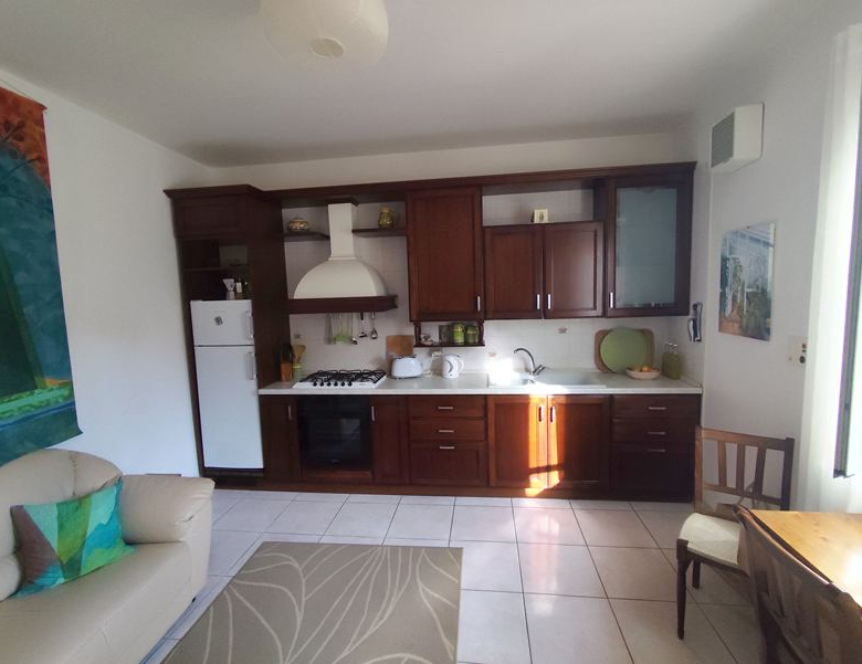 Stairs to 2nd floor with kitchen/living – one wall with fitted Scavolini kitchen, and door to 20mq terrace.